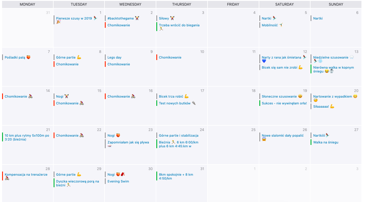 Nie wiem. Doprawdy. To chyba kwestia nawyków, konsekwencji i ciągłego udoskonalania logistyki i planowania. A w styczniu przetrenowałam 56 godzin.