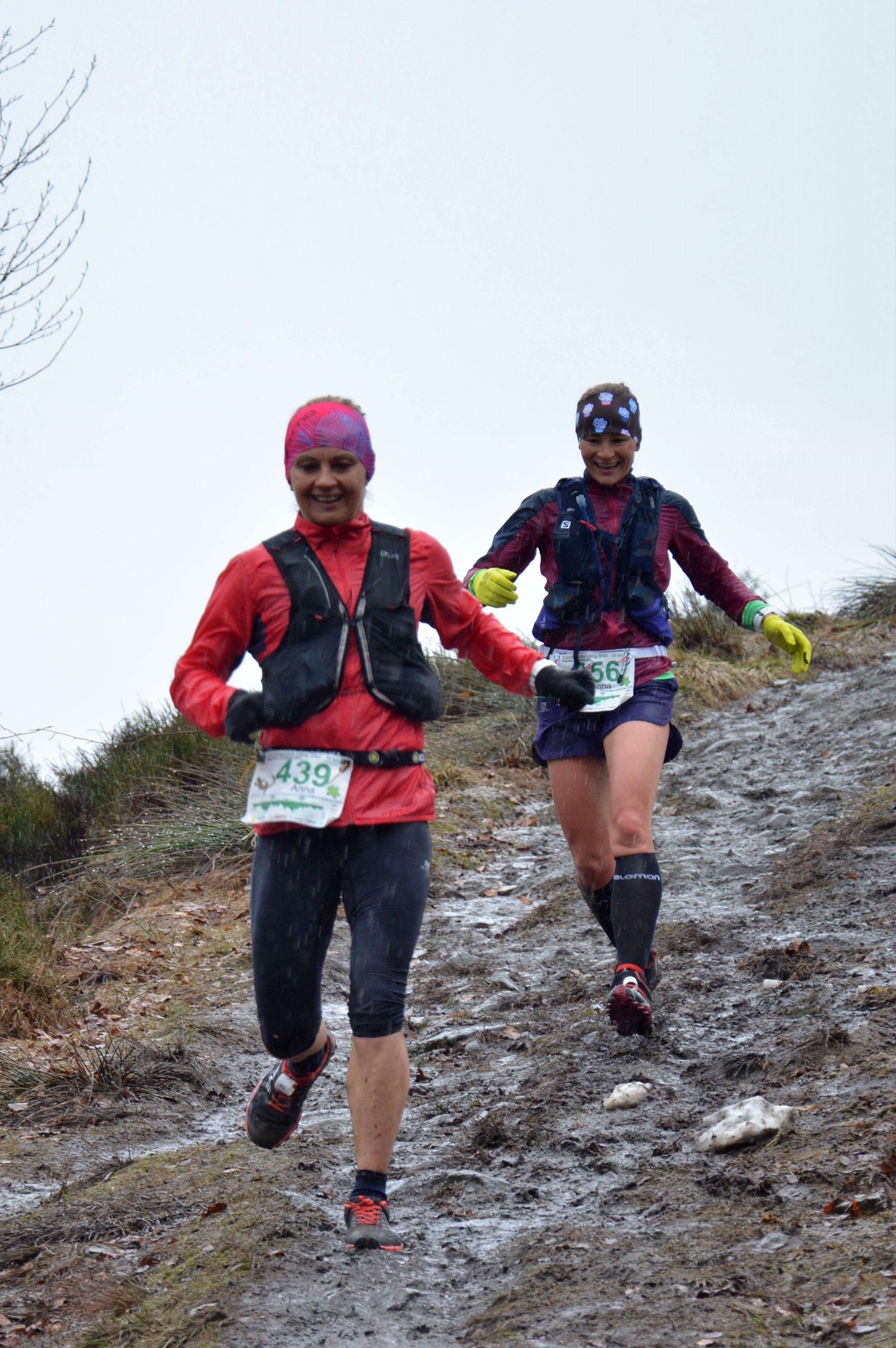 Wybiegamy na asfalt, a potem lecimy w kierunku Ostrego Nydeckiego, z którego zbieg poprowadzony jest po zboczu o nachyleniu sięgającym ponad 40%… Tuż przede mną przekoziołkował jakiś facet, ktoś się zsunął na tyłku. Do teraz nie wiem, jak udało mi się tam nie zginąć, ale Ankę z oczu straciłam na chwilę. Trzeba było gonić. Dopadłam ją jeszcze przed punktem żywieniowym w Lesznej Budzin. Lecimy dalej razem, a raczej się wspinamy.