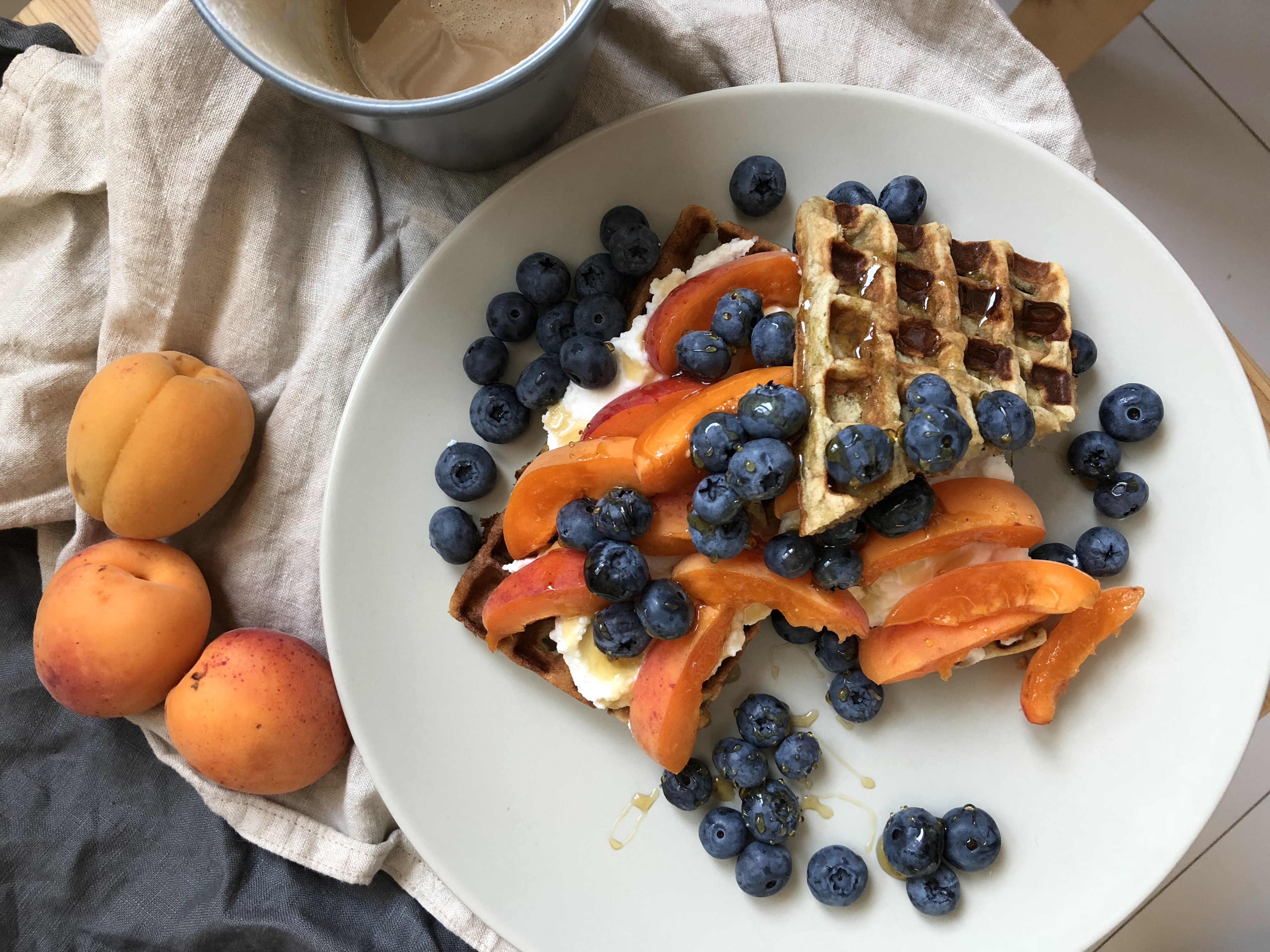 Ja swoje gofry podałam dzisiaj z kremową ricottą, morelami, borówkami i odrobiną miodu, ale możecie użyć innych owoców, jogurtu, twarogu, masła orzechowego, czy co Wam się tylko zamarzy. A jak nie posłodzicie ciasta, to nawet z jajkiem sadzonym i boczkiem.