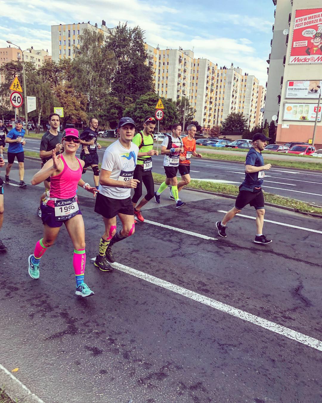 Zagryzam zęby, staram się biec równo. Skupiam się na tym. Prawa, lewa, prawa, lewa, nie kulej mała, rozluźnij się! Nagle dostrzegam pomarańczową koszulkę męża. Ej, tutaj miało go nie być! Który to kilometr? Oczywiście znowu robi mi się fajowo na serduchu, noga jakby lepiej podaje. Wbiegamy na Nikiszowiec. Tłum kibiców, piękne widoki, przebiegamy obok lodowiska, na którym uczyłam się jeździć na łyżwach w wieku 3 lat. Mam ciary na plecach, po policzku płyną łzy. Jem kolejny żel, łapię wodę na bufecie, staram się nie wychrzanić na nierównym bruku. Przybijam piątki jakimś dzieciakom. No fajnie jest. Połowa trasy wypada w Mysłowicach, moim rodzinnym mieście. Biegniemy jakiś kilometr od miejsca, w którym się wychowałam. Znowu wzrusz, bo to człowieka jakoś tak rusza. „Mamy to” mówi Patryk, półmaraton za nami! No, to jeszcze tylko raz tyle przed nami.