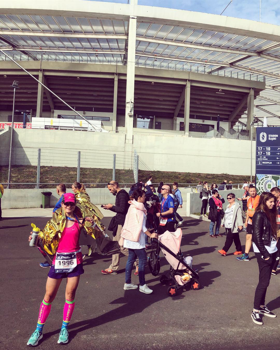 Do startu zostało pół godziny. Banan, stoperan, ventolin. Zrobione. Ostatnie łyki izo. Lekka rozgrzewka i … kurczę, znowu mi się chce siku! Do tojtojek oczywiście kolejka, jakby tam co za darmo dawali. A, dają w sumie. Ulgę. Też chcę, ale wybieram krzaczek. Nie tylko ja. W takim momencie masz głęboko w tyłku, czy ktoś zobaczy twój…tyłek. Misja zakończona sukcesem, można ustawiać się na starcie. Znajduję swój sektor. Oddaję mężowi bluzę, ostatni buziak. Trzęsę się jak ratlerek. Mam lekki atak paniki w tym tłumie, bo ja tłumów nie lubię. Poza tym ginę wśród tych wyższych ode mnie facetów obok. Przemowa prowadzącego, po której mam ciary: „nic już nie musicie, jesteście zwycięzcami”. No udało im się to, udało…