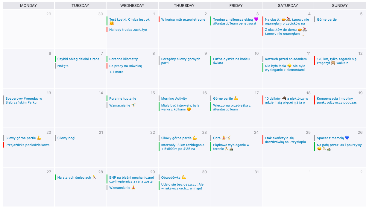 Znowu przegapiłam końcówkę miesiąca. Połowa roku za mną, a ja nie ogarniam tej mojej kuwety. Tak bardzo chcę wykorzystać każdą minutę, cieszyć się wszystkim po raz pierwszy w nowym miejscu. Pierwszymi truskawkami, pierwszymi długimi weekendami, pierwszym rozpaleniem kominka, pierwszymi wizytami na bazarku, pierwszym podlewaniem drzewek, które zasadziliśmy… Ogarniałam dom, pracę, przyjemności i jak się okazało rekordową liczbę treningów!